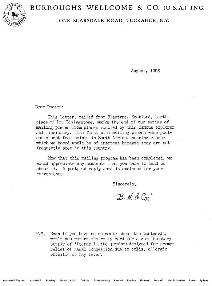 1958 Burroughs Wellcome "Livingstone" Mailing