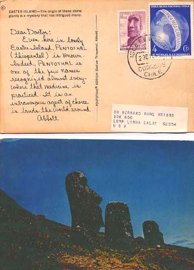Gasman600 turns out to be another anesthetist living in England. He actually collects postcards featuring operating rooms, and told dibucainecat in an email after the auction that he will be seen on an upcoming English Antiques Roadshow program displaying his collection. He saw this Easter Island card, and had placed a high bid on it as he has visited Easter Island and therefore had a special interest in the piece.
