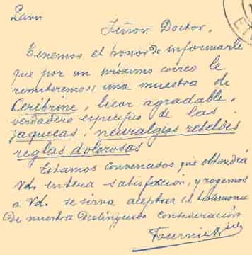 Postmarked May 2, 1913 in Paris, France, this card was written in Spanish and sent to a doctor in Bolivia. It touts a drug called Ceribrine, for neurological pain of some sort. It's interesting to note that that France appears to be the source for many postcard schemes. If anyone can shed more light on the origins of this card, please let us know! The company name at the bottom looks like "Fournier". |