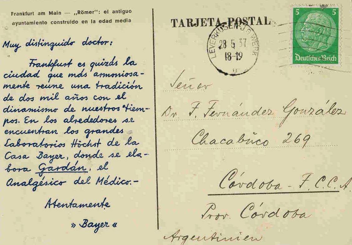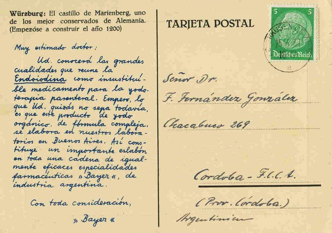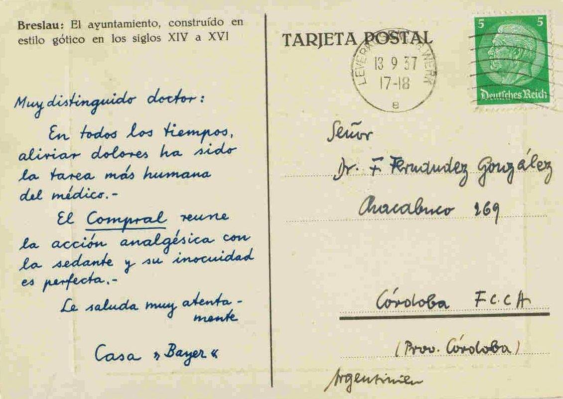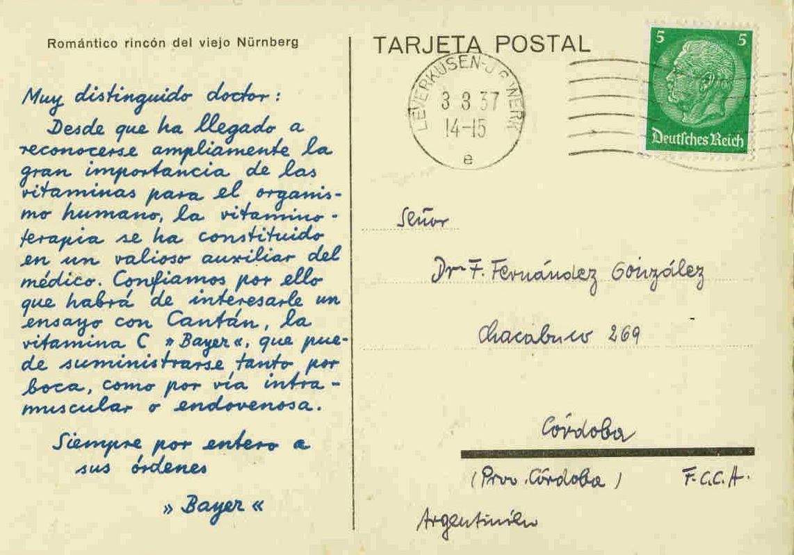 Here's a sample of cards mailed from Nazi Germany in 1937 by Bayer to doctors in Argentina. Each mentions a different drug, most of them analgesic pain killers: Cantan, Comprol, Endoiodina, and Gardan. Of course, they are in the receiver's native Spanish.