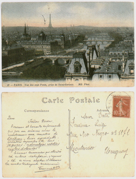 As these images will attest, the French drug company Fournier issued a series of cards sent to doctors in the South American countries of Argentina, Bolivia and Uruguay between 1911-1917, at a minimum. All start with the familiar salutation, "Dear Doctor," mailed from Paris. There are only two settings of text among all of the cards, which advertise a neurological drug named Ceribrine (or Ciribrine). On appears "signed" by Fournier at the very bottom, the other by "A Fournier."
