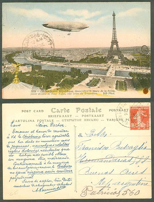 Paris- Dirigible and Eiffel Tower, postmarked January 1914, card number 3218