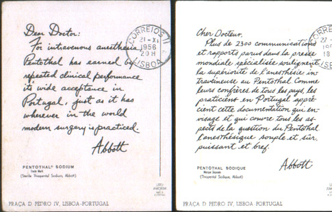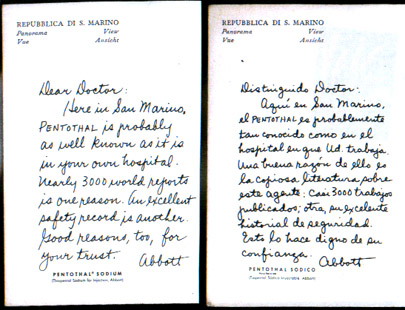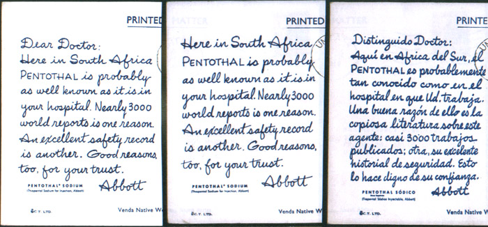 Two other exception cards listed in the Table are illustrated: San Marino – Panorama View and Castle (#142) (Figure 6), in which the script typeface of the Spanish-text version differs from the English-text version, and South Africa – Venda Native Women (#148) (Figure 7), in which the script typeface is identical for the "Dear Doctor” and Nurse-Anesthetist (no salutation) English-text versions but differs from the Spanish-text version.