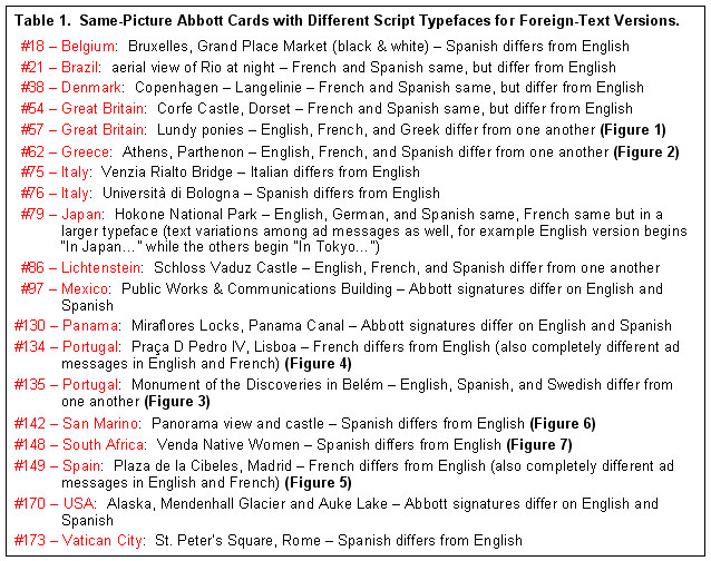 Listings and explanations are given in Table 1 for the 20 same-picture cards in my collection that I consider to have significantly different typefaces for some of their different-language-text versions. These are termed the “exception cards” ? some of which are discussed in more detail in the following paragraphs. The list in Table 1 is not exhaustive by any means as my collection lacks considerable numbers of same-picture cards in different-language texts. So, readers are urged to examine their same-picture but different-language text cards and report other examples of different typefaces.