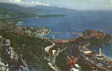 Monaco: May 16, 1959- bougainvillea flowers, card depicts a view of the city from atop a high hill (checklist #111)