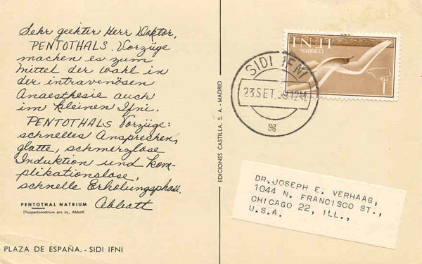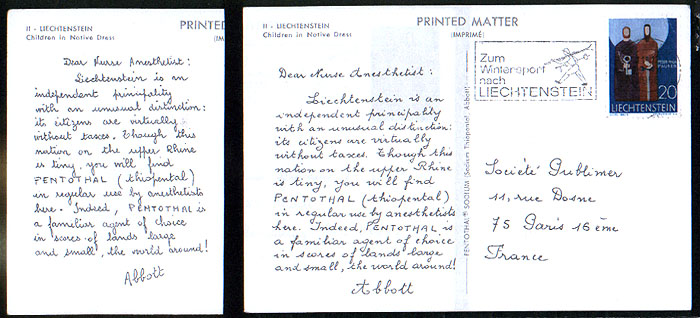 Take a closer look. This card features two "children in native dress" and come from a later Abbott mailing from 1968. These postcards (reference 87n on the master checklist) were mailed from Liechtenstein on November 28 and 29, and sent to Pennsburg, PA and Paris, France, respectively. They received the same slogan cancel and may have even gone through the same cancellation machine.
