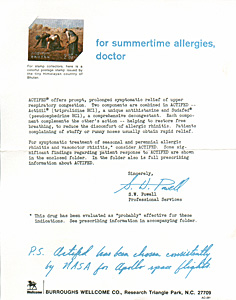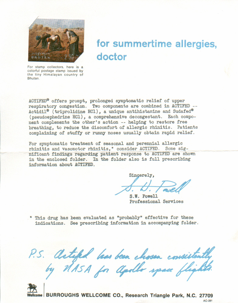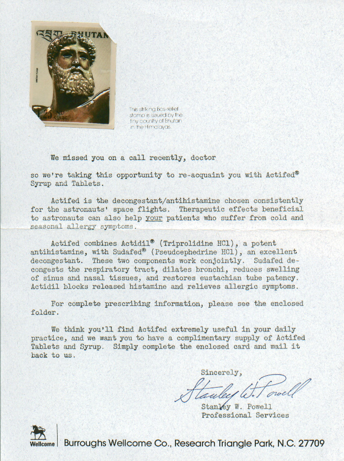 The middle letter bears a bas-relief plastic stamp showing the head of Zeus issued in 1971, 1 to 2 millimeters "thick." It is signed by the same sales rep as the first letter and starts, "We missed you on a call recently, Doctor." Again the use of Actifed by astronauts is referenced. I find it interesting that the professional services rep signed the letter in a different way than the first letter.