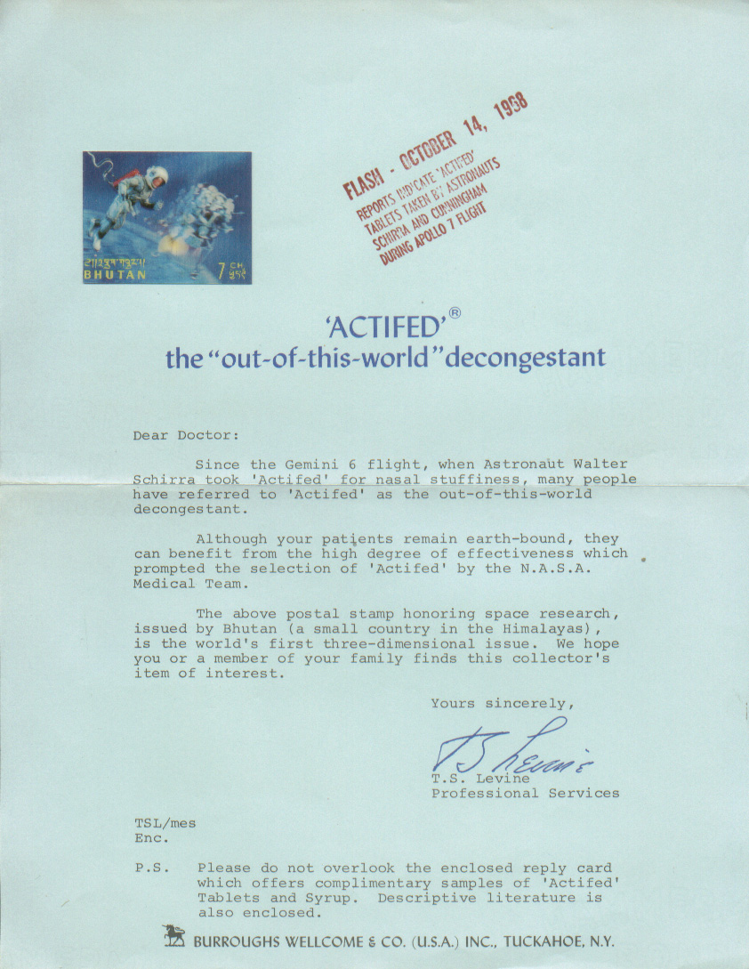 The space theme continues with the use of a plastic stamp on the third letter showing a space-walking astronaut and a firing lunar module--something that would never happen in real life! This 3-D lenticular stamp was released by Bhutan on October 30, 1967 and is touted in the text as a world's first. The red message at the top appears to be rubber stamped, reporting that two of the three Apollo 7 crew took Actifed tablets on their space flight, actually on the fourth day into their 11 day mission. Maybe command module pilot Donn Eisele just had no need for them?. This letter was signed by a different professional services rep than the other two.