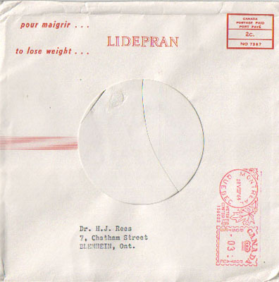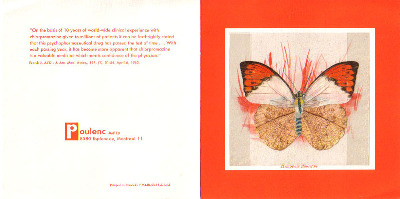 The advertisement enclosure was for Largactil, a low potency psychotic drug (chlorpromazine hydrochloride, C17H19C|N2S) that could be used for nausea, severe hiccups and even cancer pain. The other item in the mailpiece was the star attraction- a butterfly! The written text offers no clue why the insect was included in the package, viewable from the envelope's circular cutout. However another intriguing question remains: Why was the outer envelope apparently advertising another product? Lidepran (levophacetoperane hydrochloride, C14H20C|NO2) is touted as a weight loss drug! |