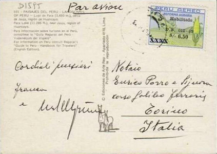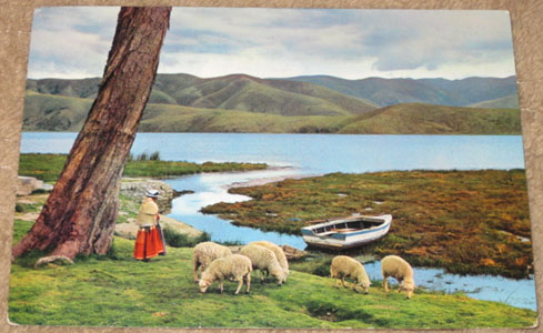 Only a part of the message portion is visible from the original owner's image, but enough of the description is visible to confirm it is a picture of "Lago de Paca" in the Jauja region of Huancayo, Peru. Sheep are seen grazing in the foreground with a native woman and a boat nearby.